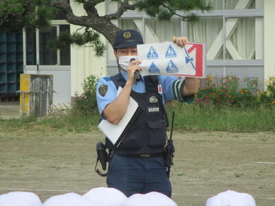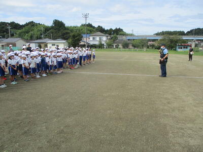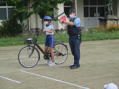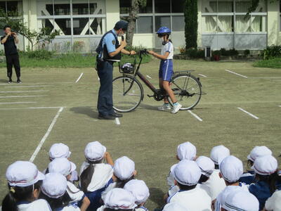 自転車については、乗る前の点検の仕方と、6年代表児童が実際に自転車に乗りながら、交差点をどのようにして渡るのかなどについてご指導いただきました。