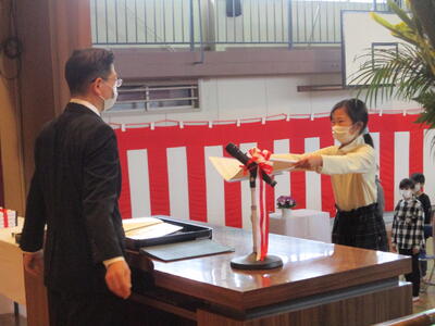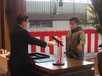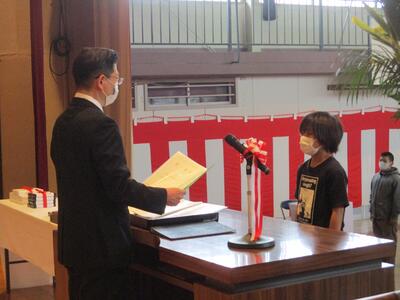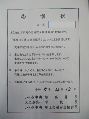 その後の委嘱状交付式では、代表の6年鈴木君が、久之浜駐在所の前田様から委嘱状を交付され、