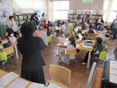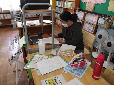 今日は、学校司書の鈴木玲子先生がいらっしゃっており、さっそく2年生が本を借りに来ていました。