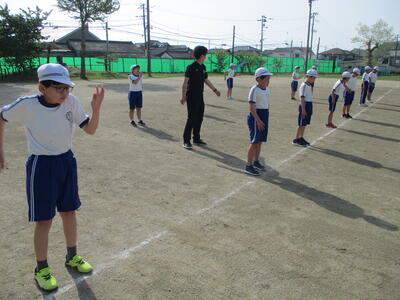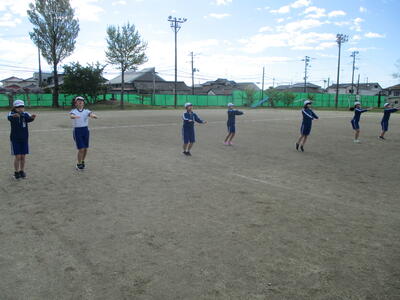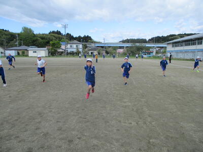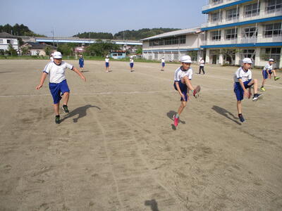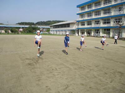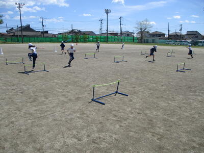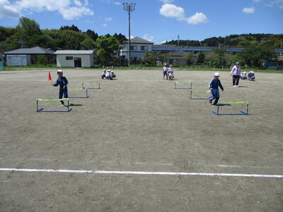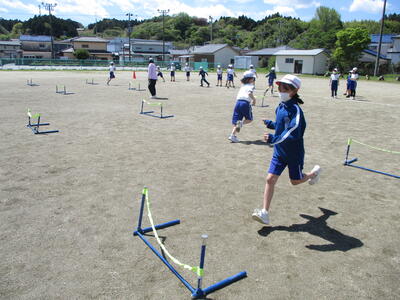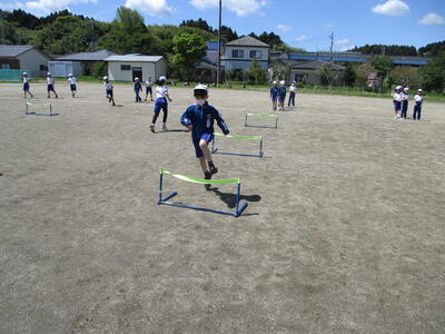 そんな天気の中、4年生は校庭で、体育科「小型ハードル走」に一生懸命取り組んでいました。