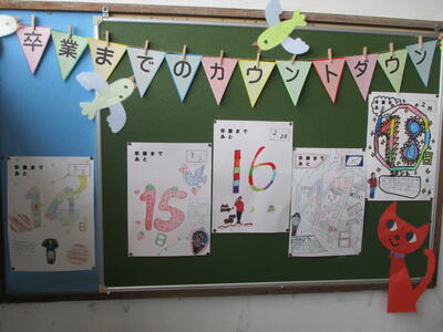 今年も6年生が「卒業までのカウントダウンカレンダー」を作成しました。卒業式まで今日を入れて8日です。これまでのカウントダウンは東階段に掲示してあります。一日一日を大切に過ごしてほしいと思います。(^^)