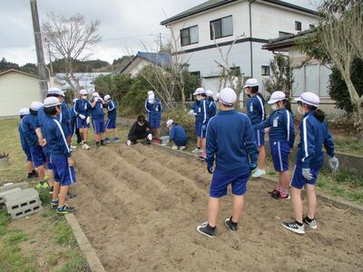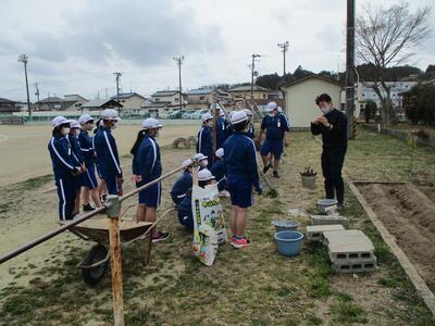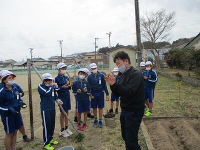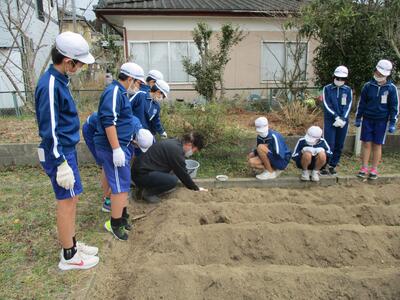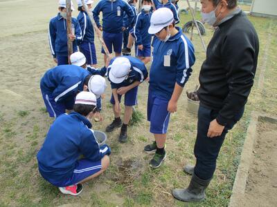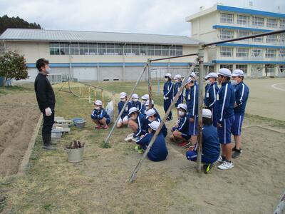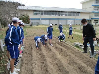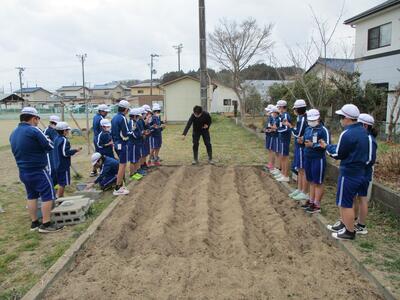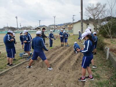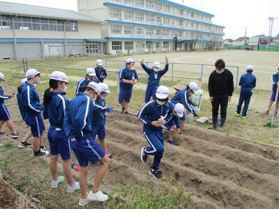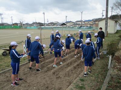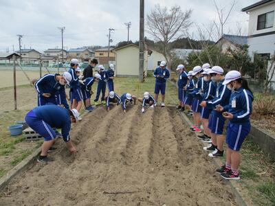 5年生は6年生になってからの学習に備えてジャガイモを植えました。先生が前もってジャガイモを半分に切り畝を作ってくれていたので、半分に切ったジャガイモに草木灰をつけ、土をかぶせて肥料をやるだけでしたが、一人一人説明をよく聞いて作業することができました。(^^)