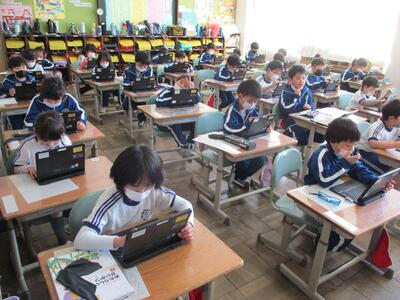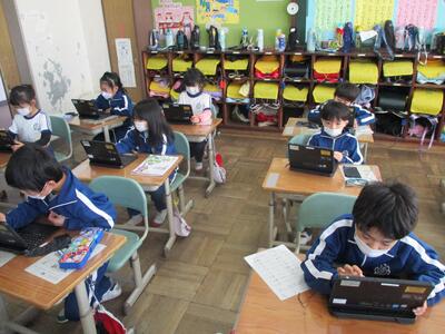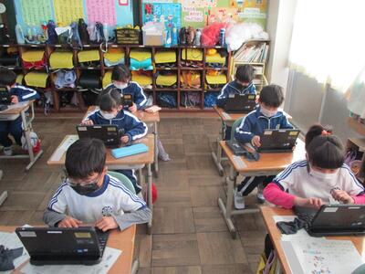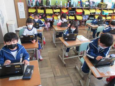 1年生は「自己紹介カード」をタブレットで作っていました。いろいろ工夫していました。(^^)