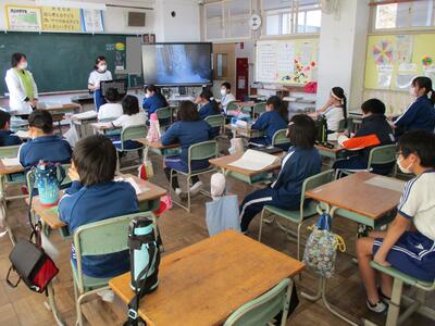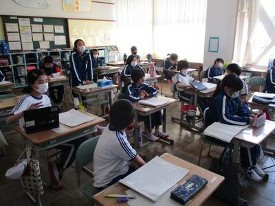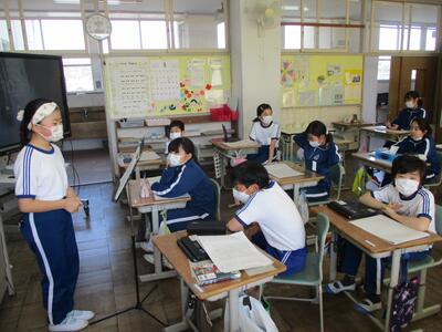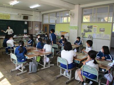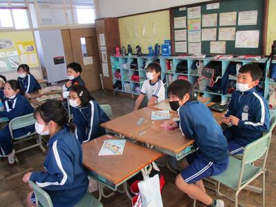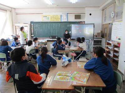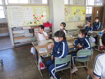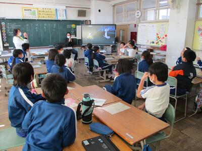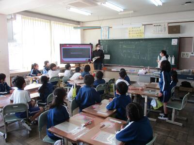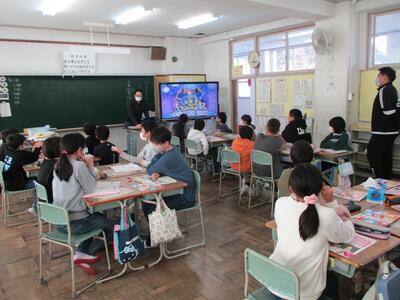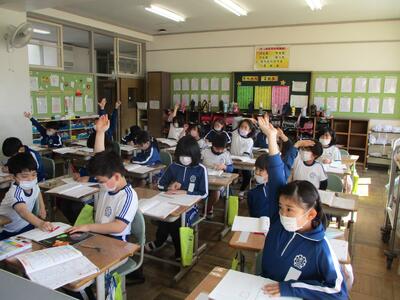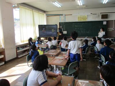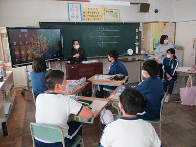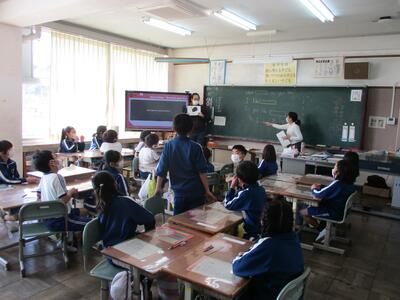 4年生は外国語活動でポケモンで単語の読み方について振り返りを行い、とても楽しそうに学習していました。(^^)
