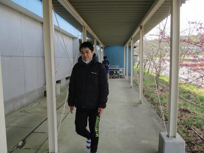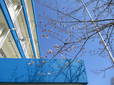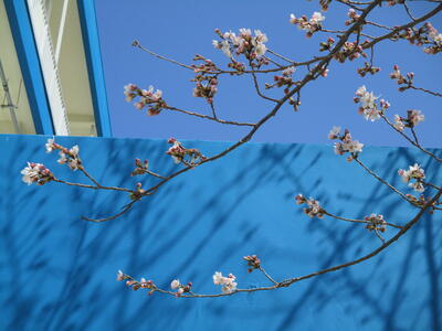今日は久しぶりに小雨が降ったのでしっとりとした空気の朝でした。卒業式まであと少し。体育館脇の桜が咲き始めました。(^^)