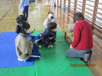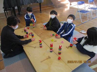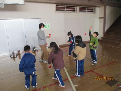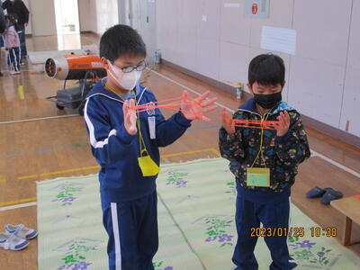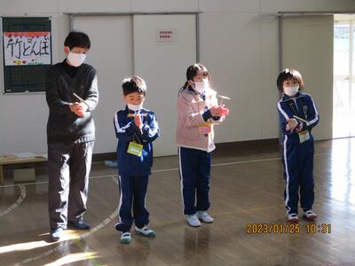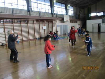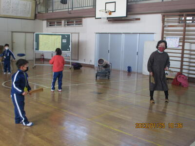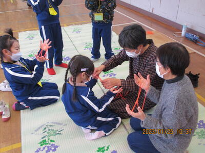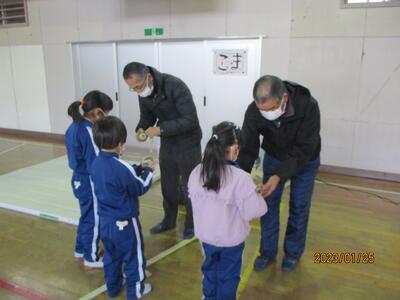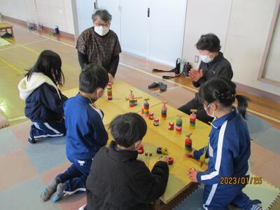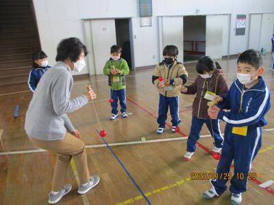 1年生は、生活科で地域の子ども育成会や婦人会の皆さんから昔遊びを教えていただきました。地域の皆さんは教えるのがとても上手なので、1年生はとても楽しそうに遊ぶことができました。(^^)