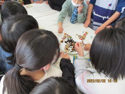 はじめにゲームクラブを見学しました。今日のゲームクラブの活動は「宝探し」と「いすとりゲーム」です。宝探しの様子を見学させていただきました。(^^)