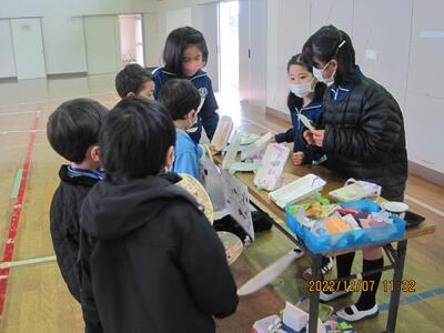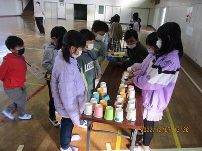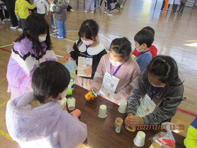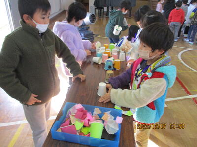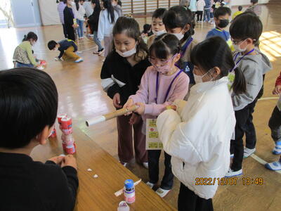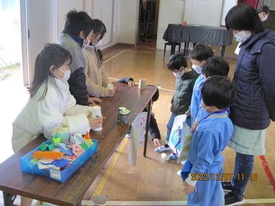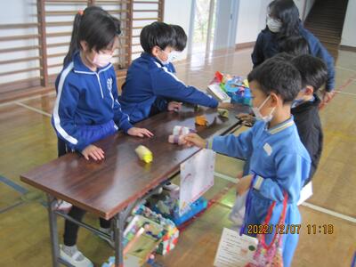 今日はこども園と保育所の年長の皆さんをお招きして、2年生のおもちゃ大会を行いました。2年生は自分達で作ったおもちゃで楽しんでもらうために、色々と準備をしてきました。楽しそうに遊んでもらって、2年生の皆さんもとても嬉しそうでした。