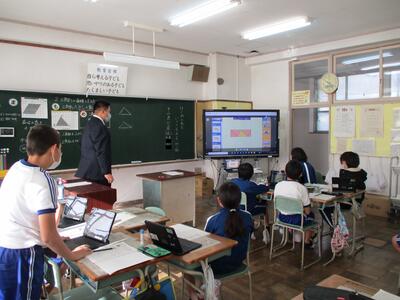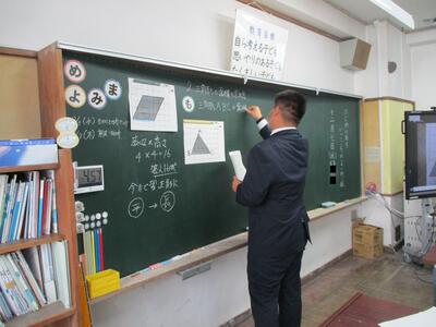 5年生で算数の授業研究を行いました。今回の授業では、三角形の面積の求め方について学習します。