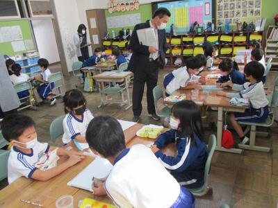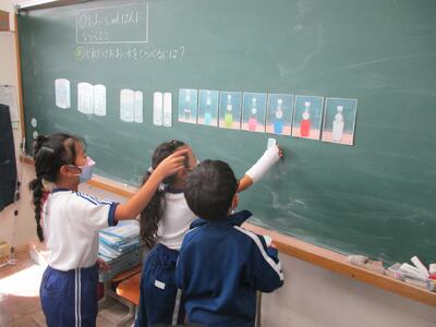 1年生で算数の授業研究を行いました。今回の授業では、大きさの違う容器に入った水の量を比べます。