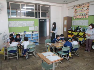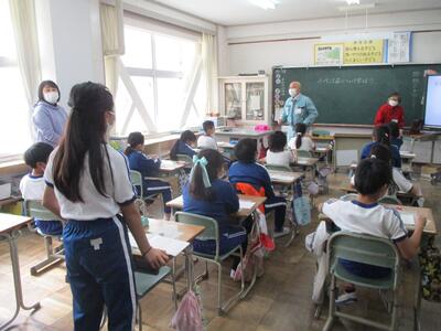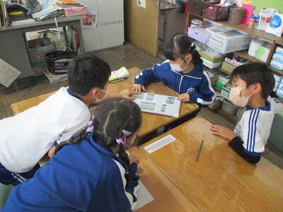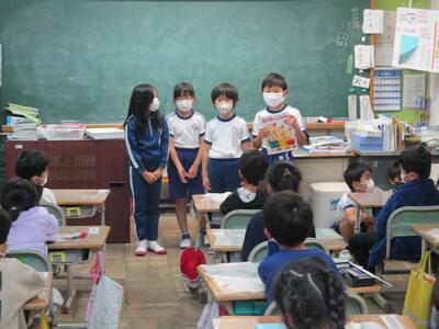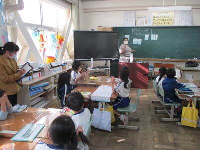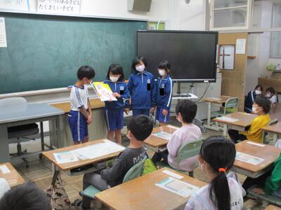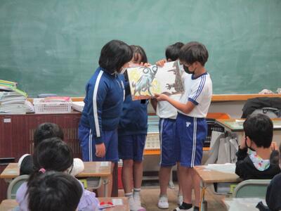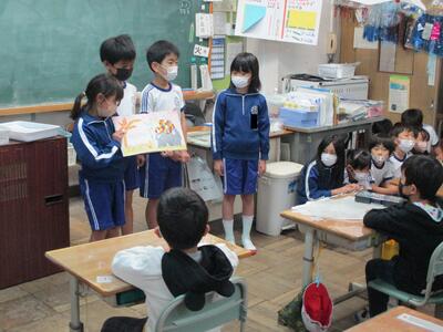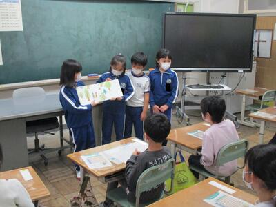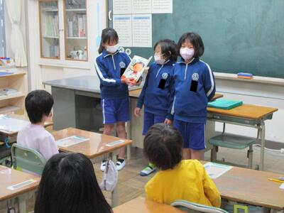 3年生が1・2年生に本の読み聞かせをしてくれました。3年生は表現の仕方を工夫しながら上手に読んでいました。1・2年生は興味深く絵をのぞき込むなどして、お話に聞き入っていました。(^^)