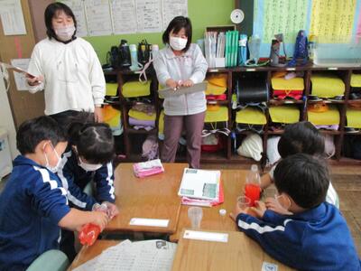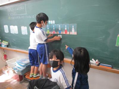 見ただけでは比べられない容器があることを知り、どうやったら違いが比べられるかをグループで話し合いました。