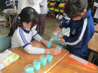 同じ大きさのコップいくつ分になるかを調べると、どちらが多いかを比べることができました。