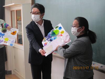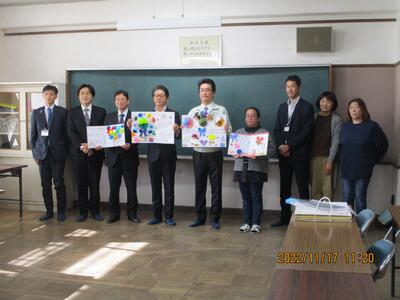 はじめに、株式会社アスムさんと福島銀行さんから、いわき市のこどもみらい部子ども支援課に対して目録の贈呈がありました。次に、こどもみらい部こども支援課から感謝状の贈呈があり、普段このトイレを利用することになる児童クラブからも、子ども達が心を込めて作ったお礼の色紙などをお渡ししました。洋式トイレにしていただき、とても助かっています。これからも、大事に使わせていただきます。ありがとうございました。m(_ _)m