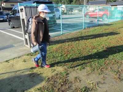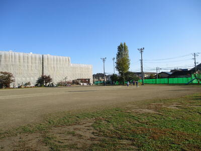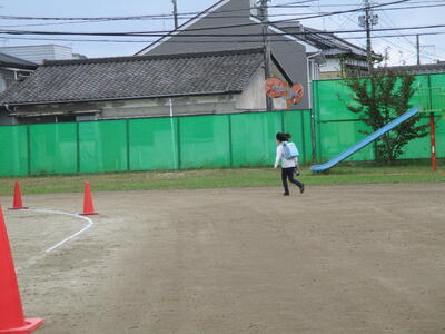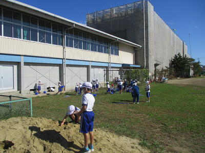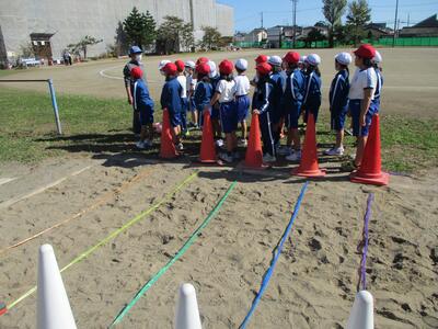 2校時目に1年生と3年生が校庭で授業を行っていました。1年生はあさがおの片付け、3年生は走り幅跳びでした。