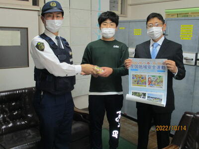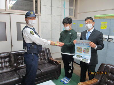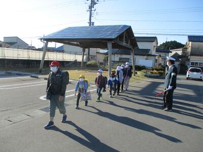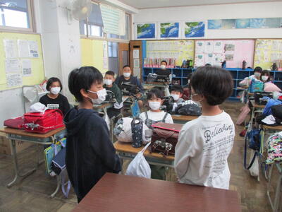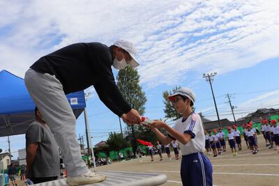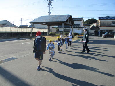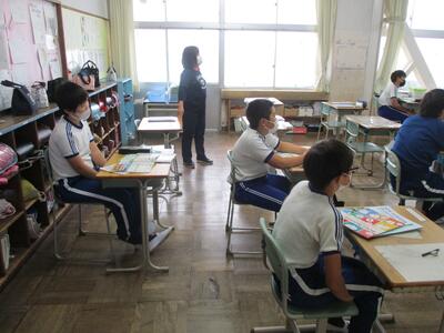 夜間や薄暮時の安全のため、「交通安全たすき」が駐在所のお巡りさんから6年生に交付されました。