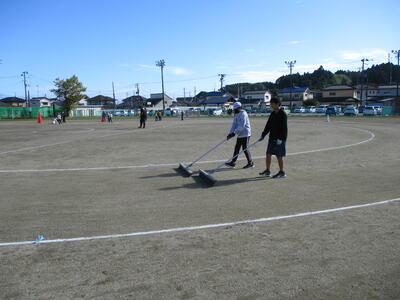いすや机を運んだり、得点板を飾ったり、校庭を整地したり、石拾いをしたり・・・。明日に向けてがんばりました。(^^)
