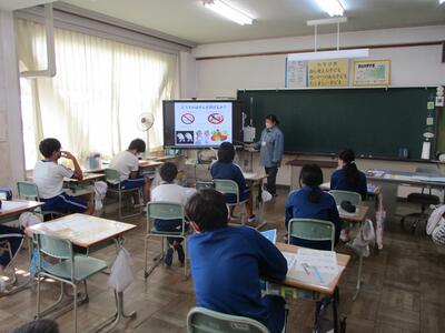6年生は「薬物乱用防止教室」を実施し、学校薬剤師の先生から、薬物の怖さ、酒やたばこの害などについて教えていただきました。また、病気の「がん」についても触れていただき、健康と安全について考えを深めることができました。(^^)