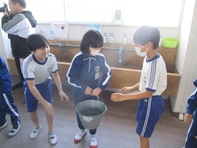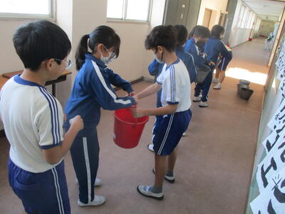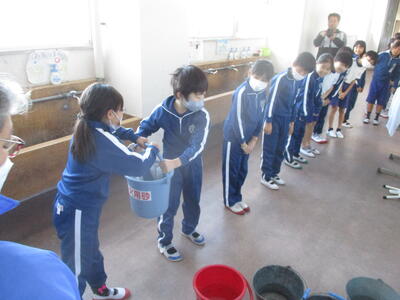 当時の映像や写真を見たり、「もしも地震にあったらどうする?」のクイズを出してもらったり、プールの水をトイレに運んだバケツリレーを体験したりするなど、4年生の子ども達も一生懸命取り組みました。