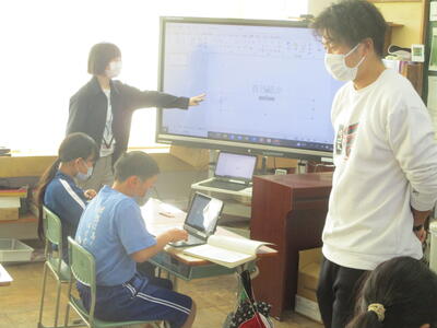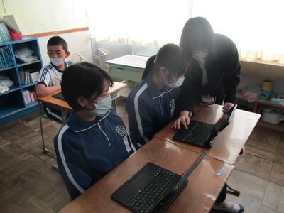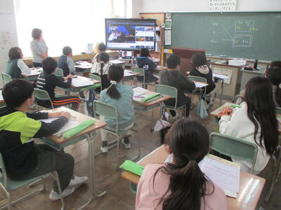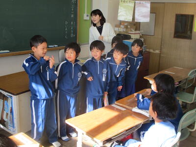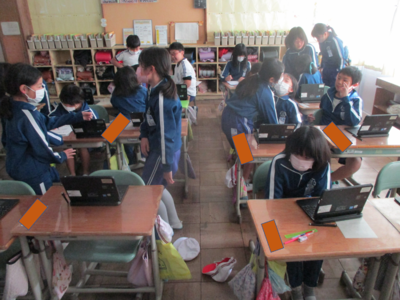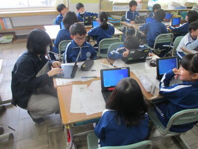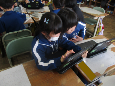 2年生は、冬休みの宿題だった動画撮影を、友達同士で見合っていました。「上手にとれてるかな?」
