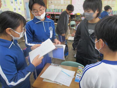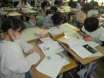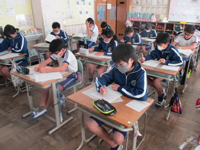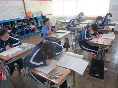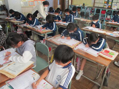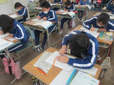 5年生は国語科「意見文を書こう」。様々なテーマで、自分の意見をしっかりとまとめています。