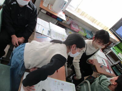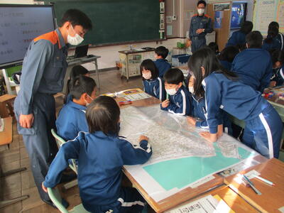 「ここ俺んちー。」「あ、ここ〇〇ちゃん家じゃん。」「これって支所だよね。」など、地図で確認しながら、津波がきたときの安全な場所や危険な場所を確認しました。