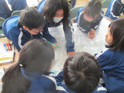 グループに分かれて、大きな地図に避難できる場所や安全な場所、危険な場所、車が通る場所などをペンで書き込んでいきました。
