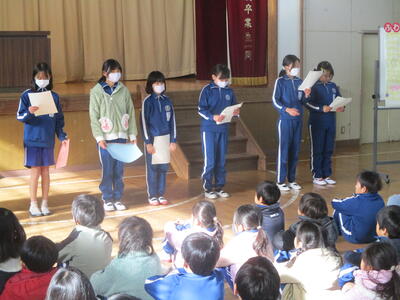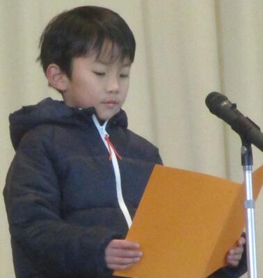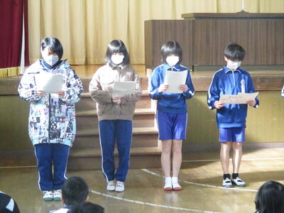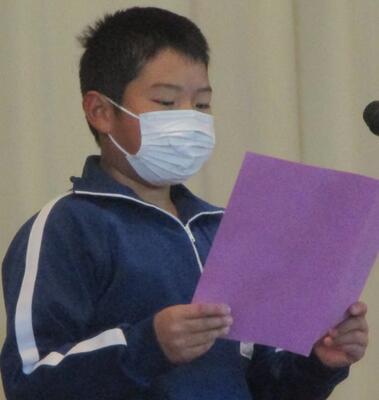 今日の児童集会では、はじめに1年浅野君、3年四條君、5年坂本さんの作文発表がありました。