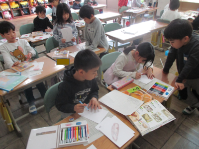 1年生は、幼稚園生が来るときに行う、お店屋さんごっこのカード作りに夢中でした。