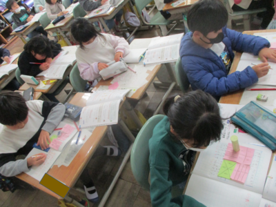2年生は、同じ大きさの分数について考えています。付箋や図などを用いるなど、ノートにも工夫が見られます。