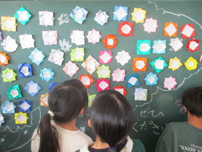 4年生は花さき山の学習中。友達の良さやありがとうの言葉で、久之浜一小バージョンの花さく木の完成です。