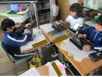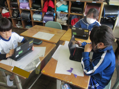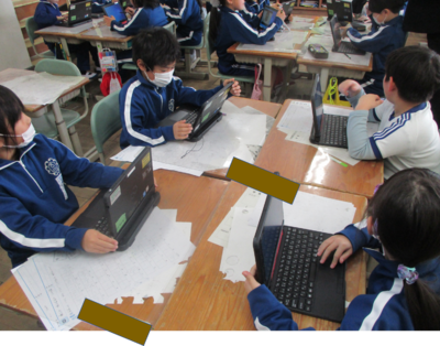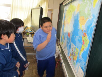 6年生は社会科。グループごとに調べた日本と関係の深い国々について、発表する準備中です。