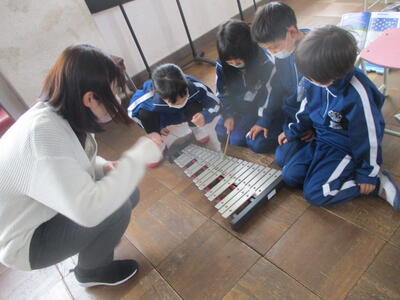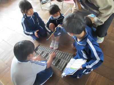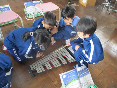 1年生は、音楽室でグロッケンの練習中でした。きれいな音が出ていました。