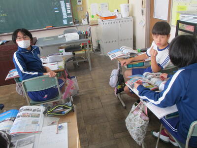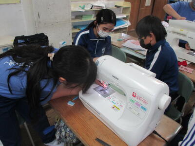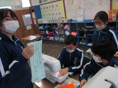 5年生は家庭科でミシンに挑戦中。練習布をグループで教え合いながら縫いすすめていました。なかなかに上手です。