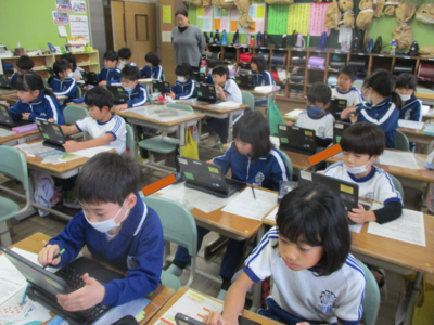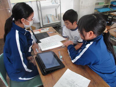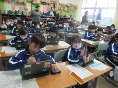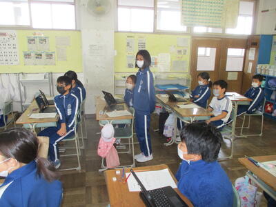 2年生は、冬休みに持ち帰るタブレットで何をするのかについて、担任の先生とICTサポーターの先生に教えてもらっています。いろいろなことができそうですね。