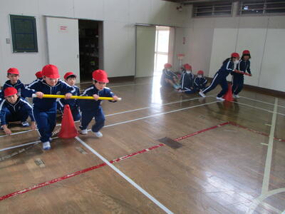 2年生はミニ運動会で楽しんでいました。ぐるぐるタイフーンです!