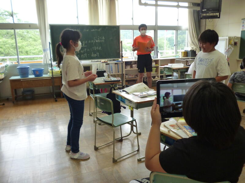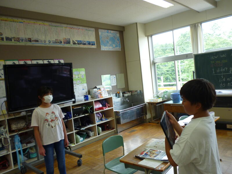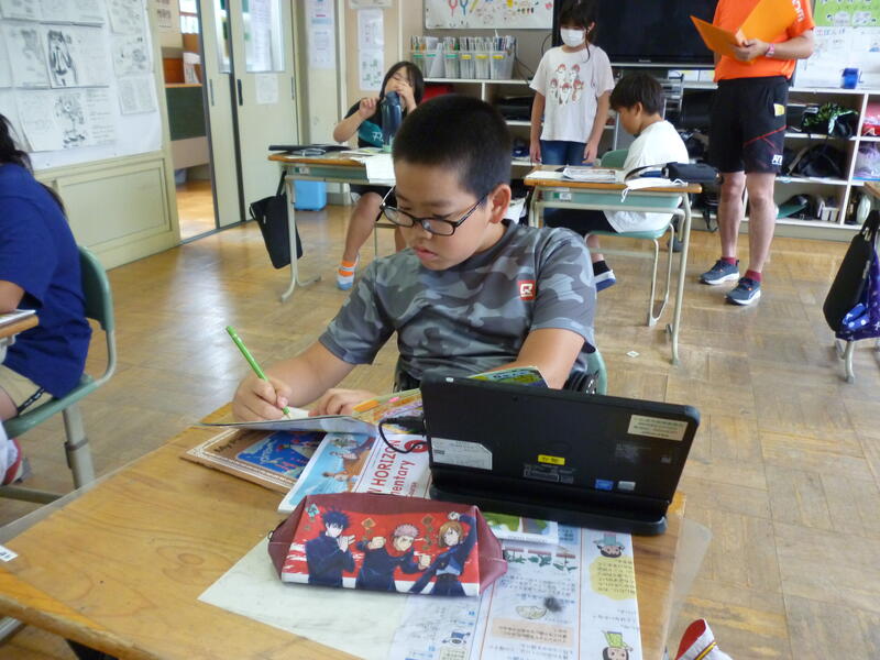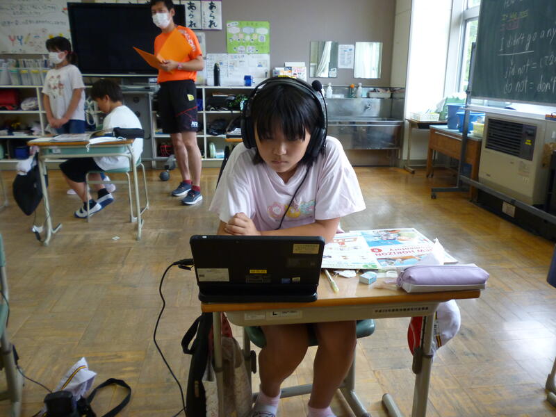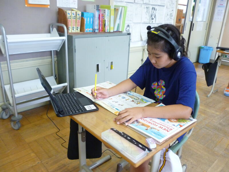 (5・6年生外国語の授業です。それぞれの学年の課題に向かって一生懸命取り組んでいました。)