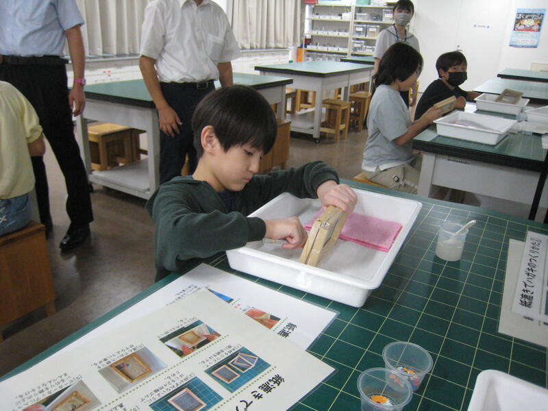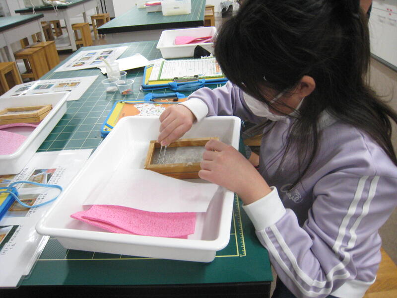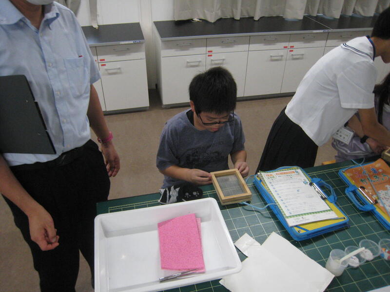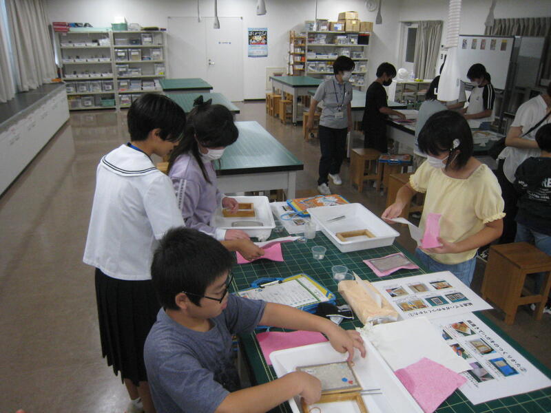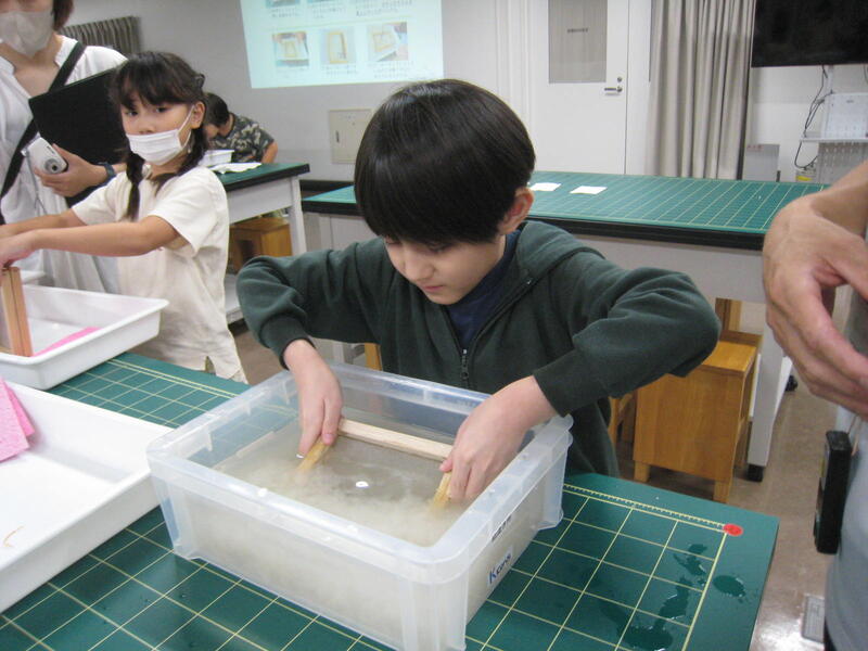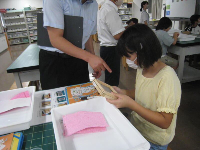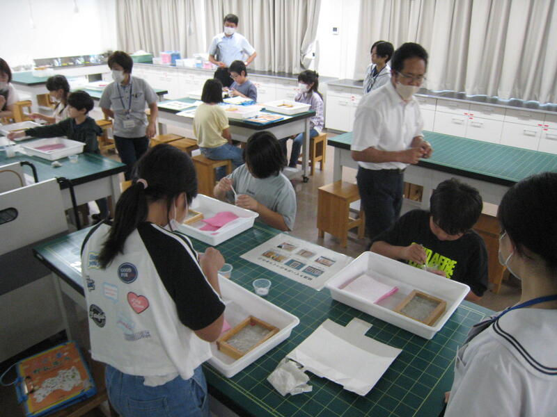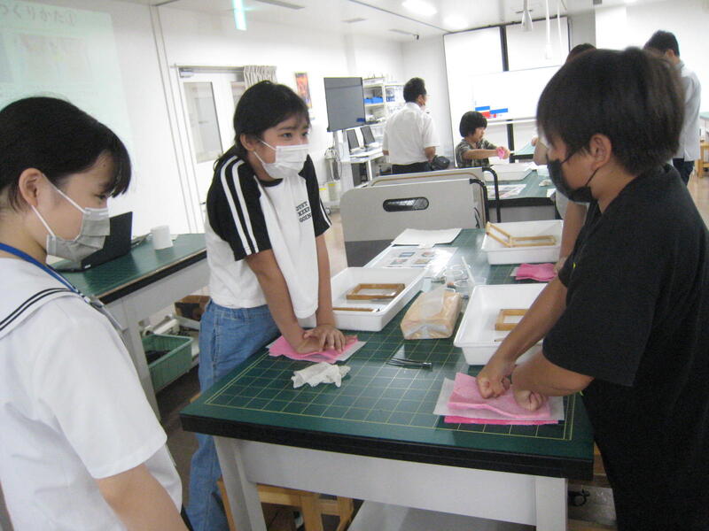 (紙すき体験では、地元の中学生にも教えてもらいました)
