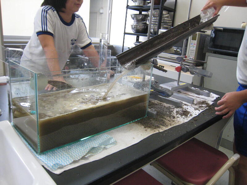 地層をつくろう! 2024年9月20日 12時00分 6年生の理科では、土砂の上から水を流し、地層をつくる実験をしました。流す水の量を増やすと土砂が流れていく様子に子どもたちは驚いていました。地層ができているか来週の授業が楽しみです。