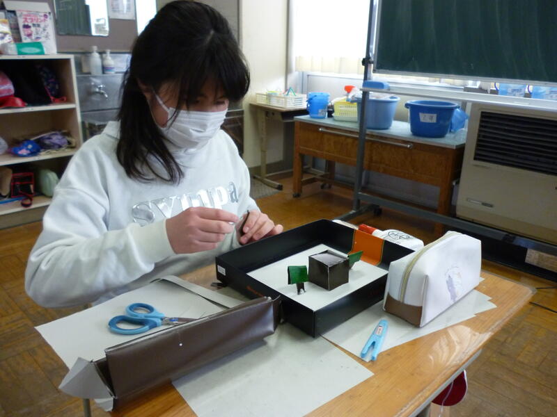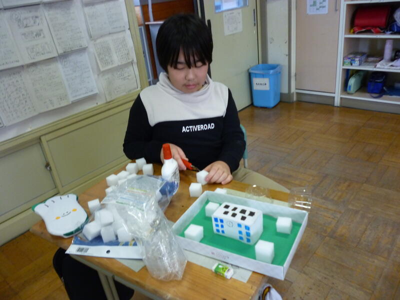 6年生の図画工作の授業では、「あったらいいなプロジェクト」の単元で一人一人が考えた理想の街や施設を模型にしようと取り組んでいました。「二酸化炭素の排出を抑えた街づくりを模型で表したい!」と一生懸命作品づくりに励んでいました。