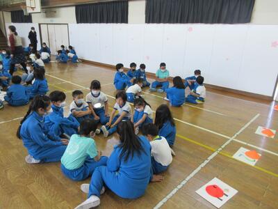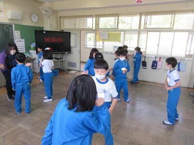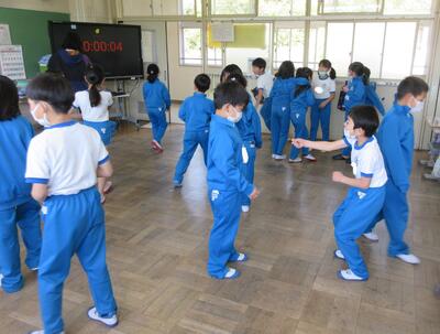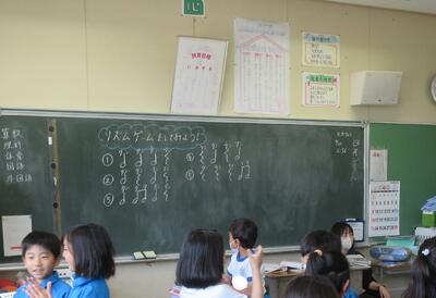 3年生は、音楽の授業、リズム遊びです。トントントンウン、トンウントンウン、…様々なリズムを手拍子で練習します。音楽に合わせて、好きなリズムを打ち、同じ仲間で集まったり、ジャンケンをして勝った人がリズムを広め、楽しんでいました。