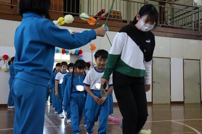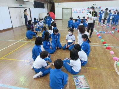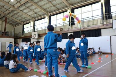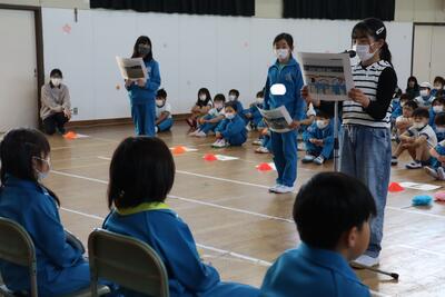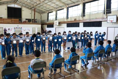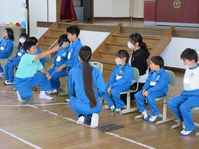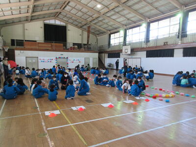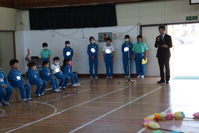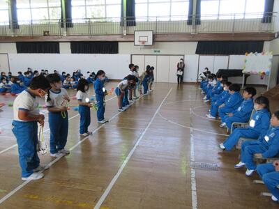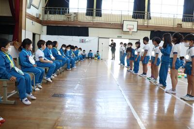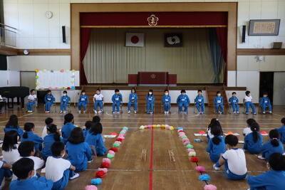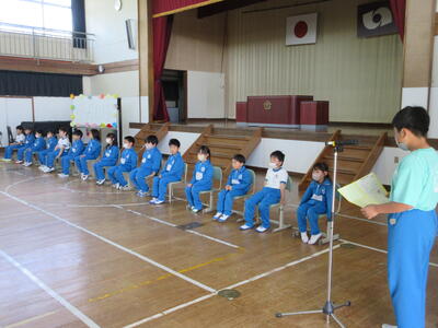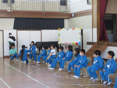 令和5年4月27日(木)、1年生15名のために、体育館で入学おめでとう会を実施しました。校長より、2年生から6年生へ「1年生は色々なことで不安に感じることが多いので、困っているときには、やさしく『どうしたの』と声をかけ、親切に教えてほしい。」1年生へ「親切にされたら、『ありがとう』とお礼を言ってください。」そして、全校児童へ「これから、みんなで仲良く助け合いながら、生活していきましょう。」と話をしました。