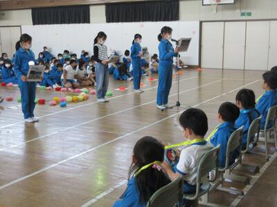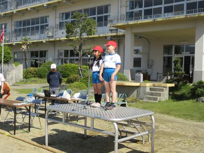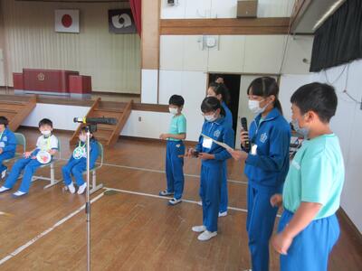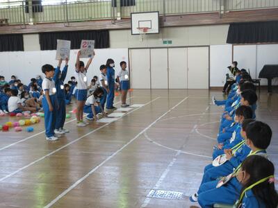 6年生は、「運動会」についての紹介です。ラジオ体操、徒競走、チャンス走、玉入れ、紅白対抗リレーについて、具体的に説明しました。「勝っても負けても楽しい運動会にしてくださいね」と呼びかけました。