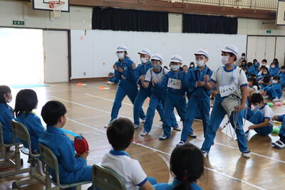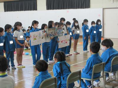 5年生は、「やしおみ登山」についての紹介です。「やさしいお兄さん、お姉さんが助けます。」「頂上から見えるのは、東京タワー、マリンタワー、東京スカイツリーのどれ?」とクイズ、そして、「1年生と一緒に山登りができるのを楽しみにしています。」と伝えました。