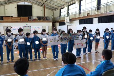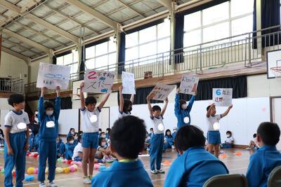 1年生は、学校紹介を聞くことができ、喜んでいました。最後に、学校○×クイズ、「上遠野小学校は、創立150周年、〇か×か?」…そして、縦割り班顔合わせを行いました。2年生から6年生の皆さんが、心をこめて、準備したことが伝わり、とても楽しい時間になりました。