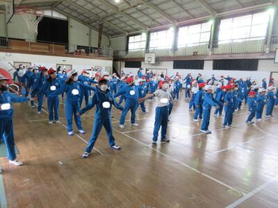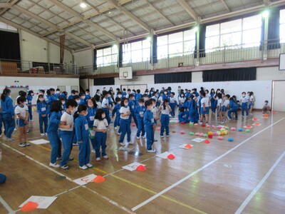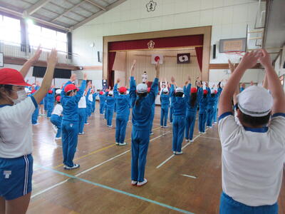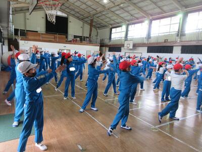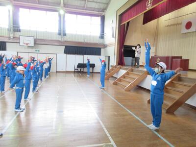 令和5年5月8日(月)、運動会の全体練習を体育館で行いました。開閉会式とラジオ体操です。スポーツ健康委員の児童が前に出て、ポイントを確認しながら、練習しました。「のびの運動、腕をよく伸ばしてゆっくり高くあげ、背筋を伸ばします。…」後半は、担任の先生が子どもたちの前に出て見本となり、練習しました。みんな揃うと、気持ちも揃ったみたいで、気持ちいいですね。