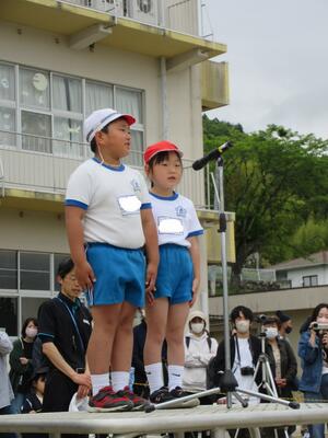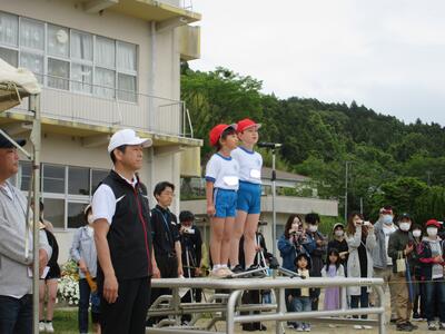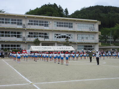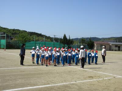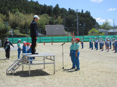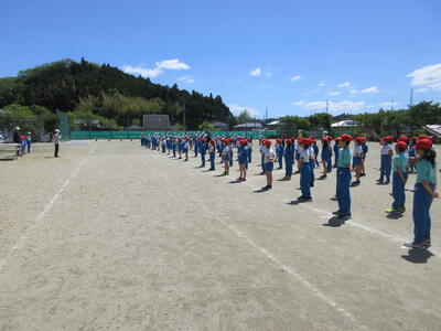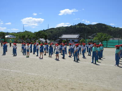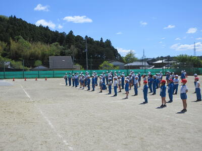 令和5年5月2日(火)の3校時に、運動会の全体練習をしました。1年の代表児童が元気よく返事をし、「令和5年度上遠野小学校、創立150周年記念運動会をはじめます」と開会を宣言し、練習がスタートしました。式の順序に従い、国旗掲揚や優勝カップ返還、誓いの言葉など、代表児童中心に動き方の確認をしました。青空の下、全校児童が一堂に集まり、練習する姿は、見ていてすがすがしいものがあります。