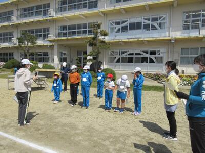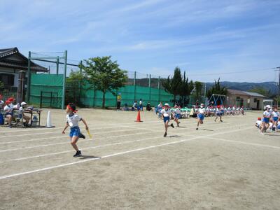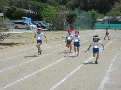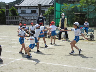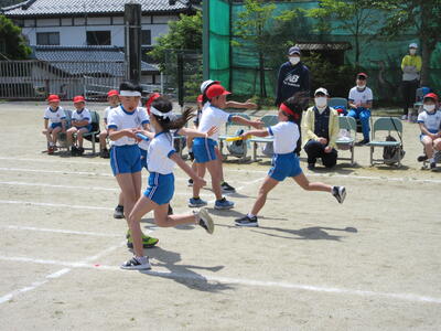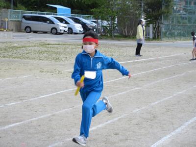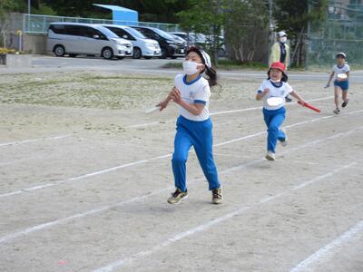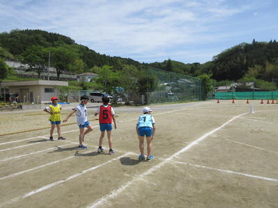 令和5年5月1日(月)の大休憩に、リレーの入場と走る練習をしました。まず、始めにリレーの走る順序、並び方を確認し、走る場所まで移動しました。1年生からのスタートです。「最初はグー、ジャンケンポン」と4人の走るコースを決めます。6年生が優しく見守っています。「よーい、ドン」本気になって走ります。応援の声も真剣です。今日の結果は、秘密です。どのチームもガンバレ、運動会当日、一生懸命の走りを期待します。