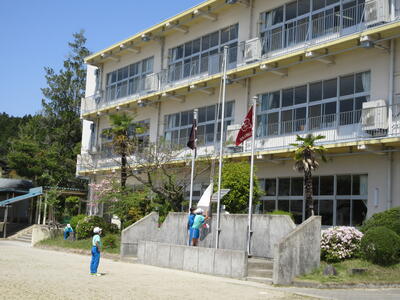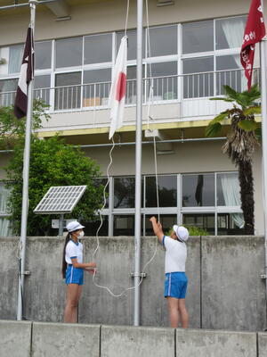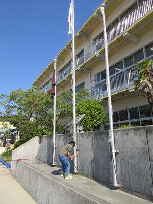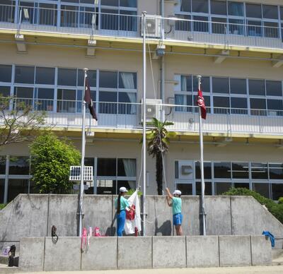 令和5年5月12日(金)、朝の活動の様子です。運営委員の6年生が、責任を持って、校旗、国旗、市旗と順に掲揚を行っていました。3つの旗が揃って、清々しい1日のスタートです。