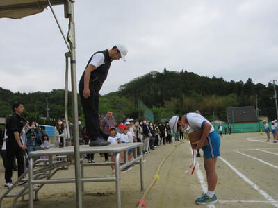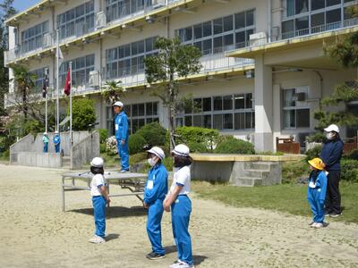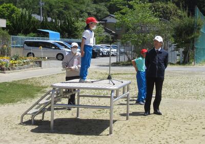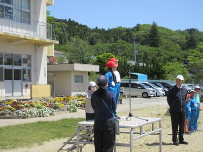 令和5年4月28日(金)の大休憩に、代表児童が校庭に集まり、運動会の開閉会式の練習をしました。式の順序に従い、開式の言葉から閉式の言葉まで、国旗掲揚、優勝カップ返還、誓いの言葉、成績発表、優勝杯授与など、役割分担や動きを確認しました。5月13日(土)、“創立150周年”の節目の年に実施する運動会に向けて、毎日、準備を進めています。